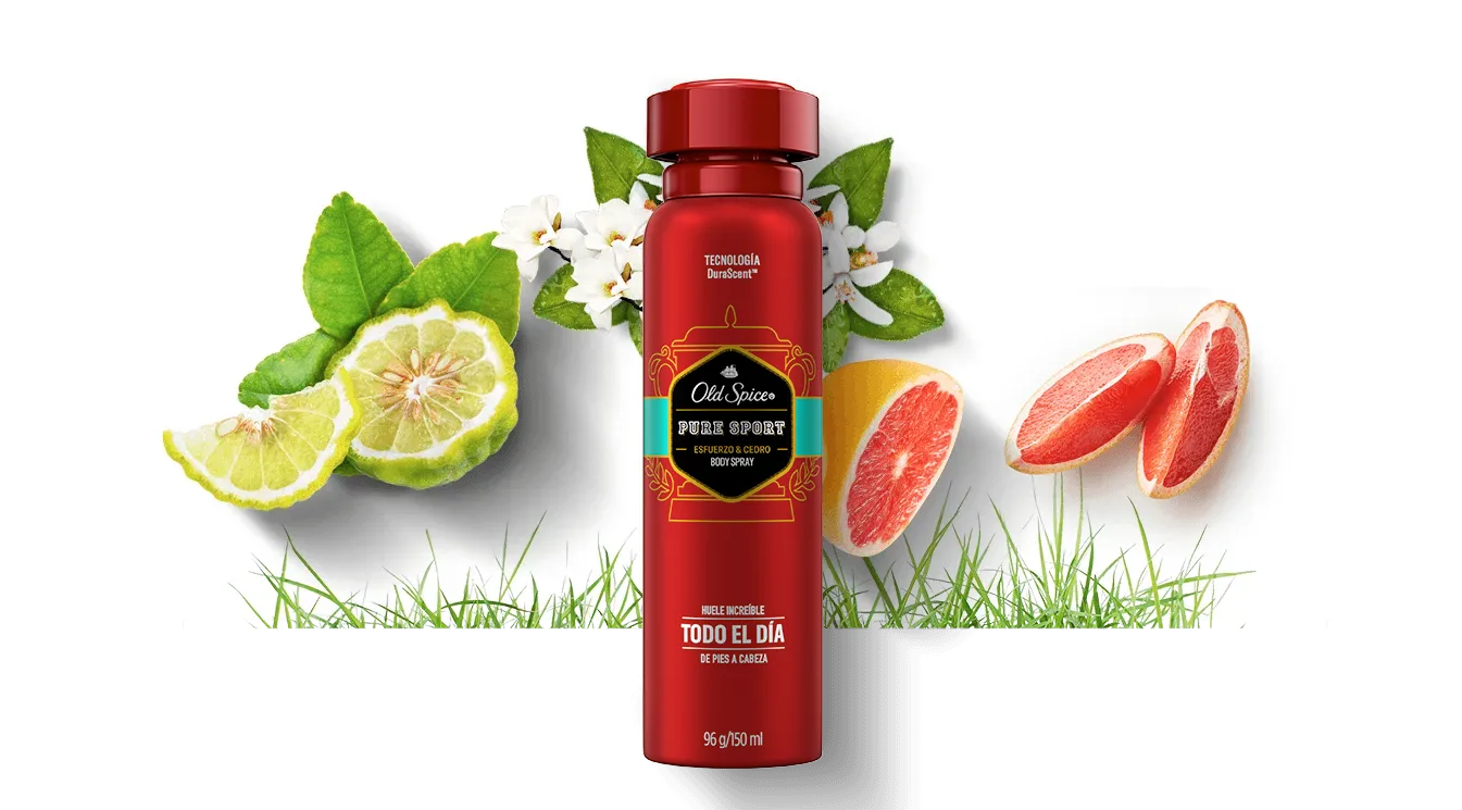Prueba el desodorante corporal en spray para hombre Old Spice Puresport con tecnología DuraScent™, que hace que su fragancia dure muuuuucho más, y huele increíblemente bien de pies a cabeza durante todo el día.